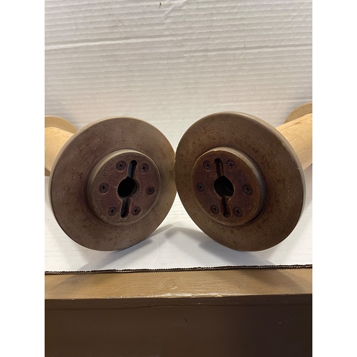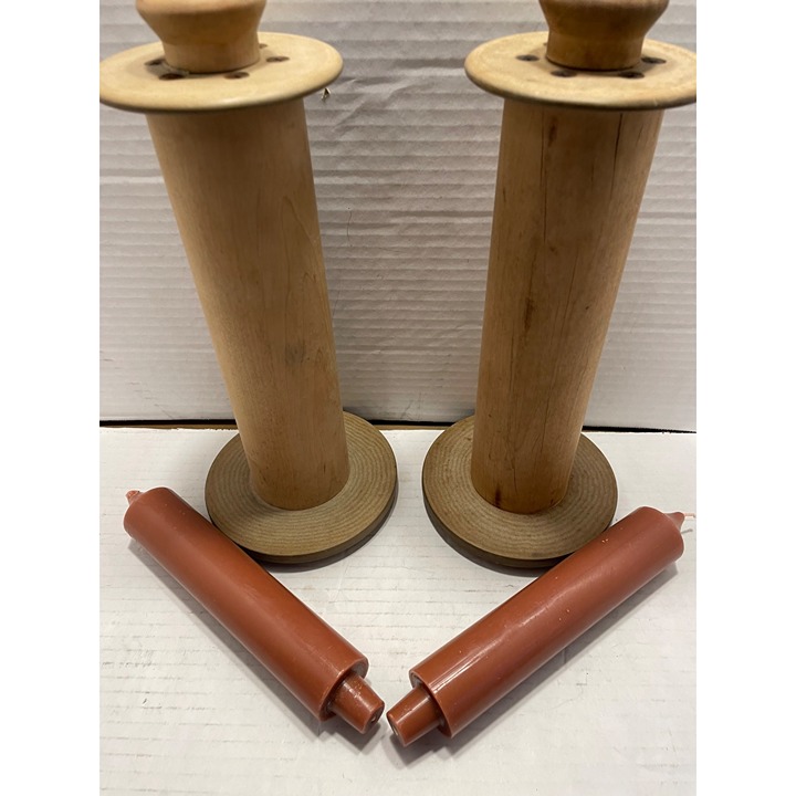 This is a beautiful set of vintage handcrafted wooden spool candle holders. They are very large and wide and will make a statement in any decor. The Height is the Spools is 12" and 5" at base. Please see all pictures and ask any questions. They come with the vintage candles too that are 9"H and 1.5"D.
