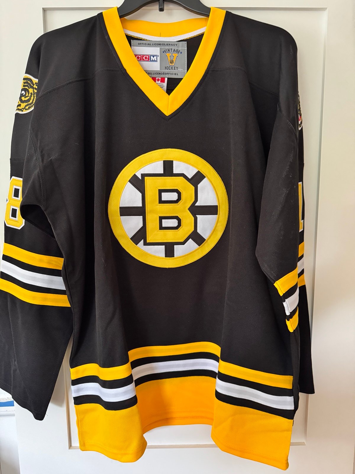 This is a brand new never worn Adam Sandler happy Gilmore 1980s style Boston Bruins hockey jersey it is size 54 all names numbers and patches are sewn on the difference between this jersey and a lot of jerseys you see online is that this one has the official Boston Bruins crest on the front rather than just having Boston or Bruins font on the front of the jersey. My experience with these type of jerseys is they run slightly small I normally like my hockey jerseys in a XXL so for me I usually take an XXXL one size up.