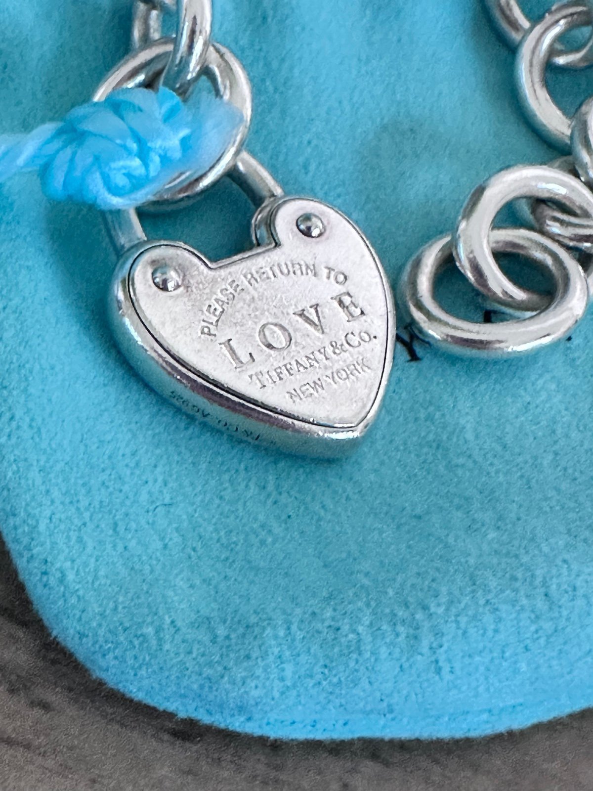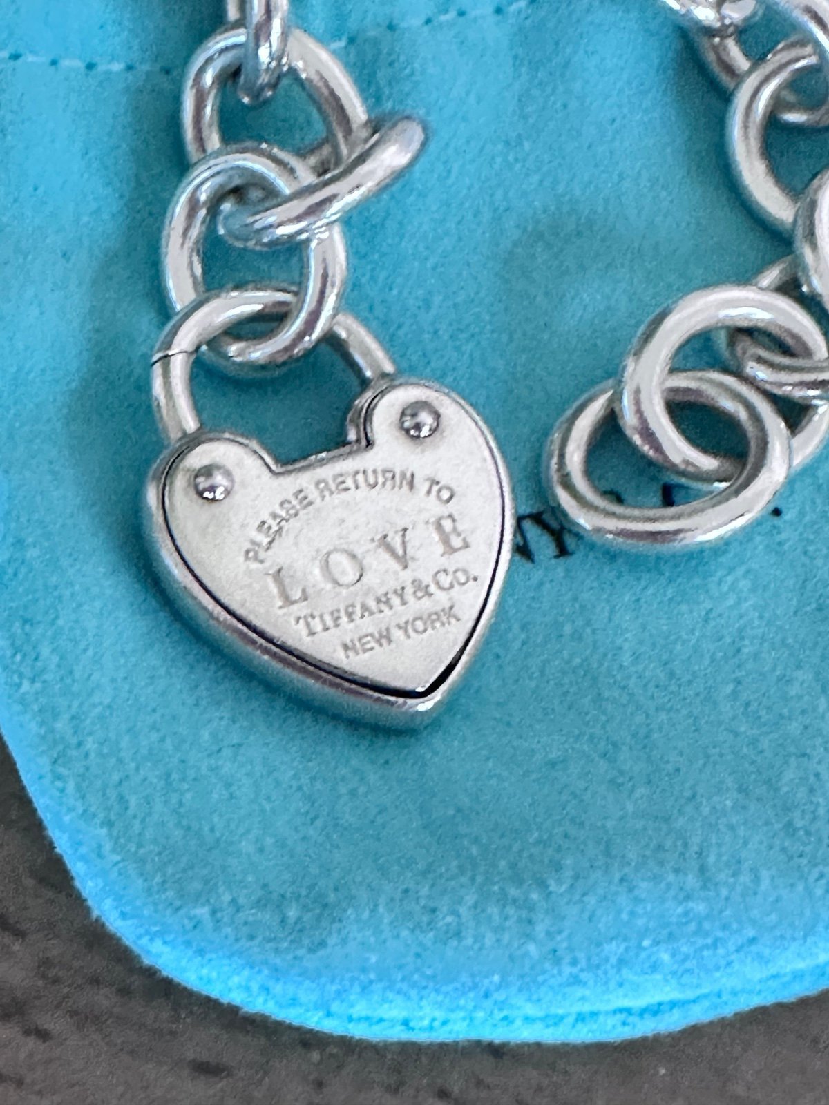 Authentic PreLoved Return to Tiffany's Love Lock bracelet. Comes with the blue bag as pictured :) This is beautifully crafted in 54 grams of .925 sterling silver. The link bracelet is held together by a solid sterling silver heart with spring hinge. The heart does open and this bracelet is bold and brilliant. It is in very good used condition with superficial scratches to the heart that are barely noticeable unless looking very close. It has only been worn a few times and always kept in its Tiffany's pouch. The chain is 8" long because had 2 links added by Tiffany's for an additional $220. Tiffany's offers lifetime free cleaning in-store. The bracelet will ship USPS First Class with insurance.