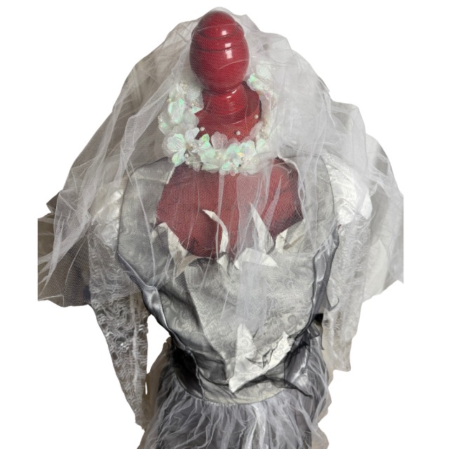 The Dead Bride costume includes a dress, veil with blusher, and bouquet. The dress slips over the head and secures with a small Velcro closure in back. Made with sheer lace sleeves and jagged, torn fabric detailing for a haunting, decayed look. The original brooch is missing but barely noticeable, and $1 has been deducted. Wig and shoes not included. 100% polyester. Hand wash cold, line dry, no bleach.