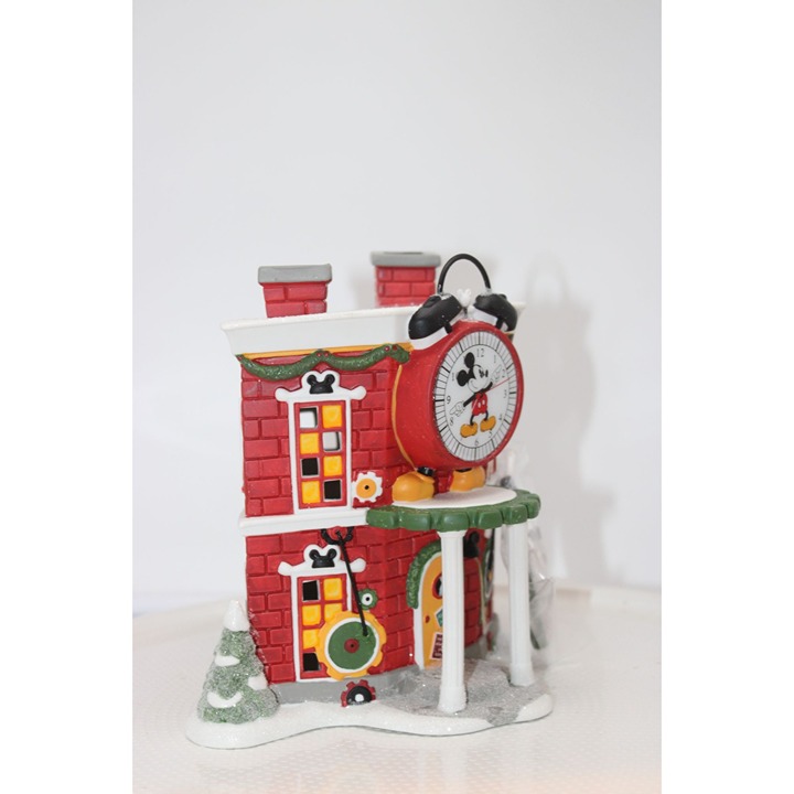 This Department 56 Mickey's Merry Christmas Village piece, Mickey's Alarm Clock Shop, is a charming, hand-painted ceramic collectible that brings a touch of Disney magic to your holiday decor.
