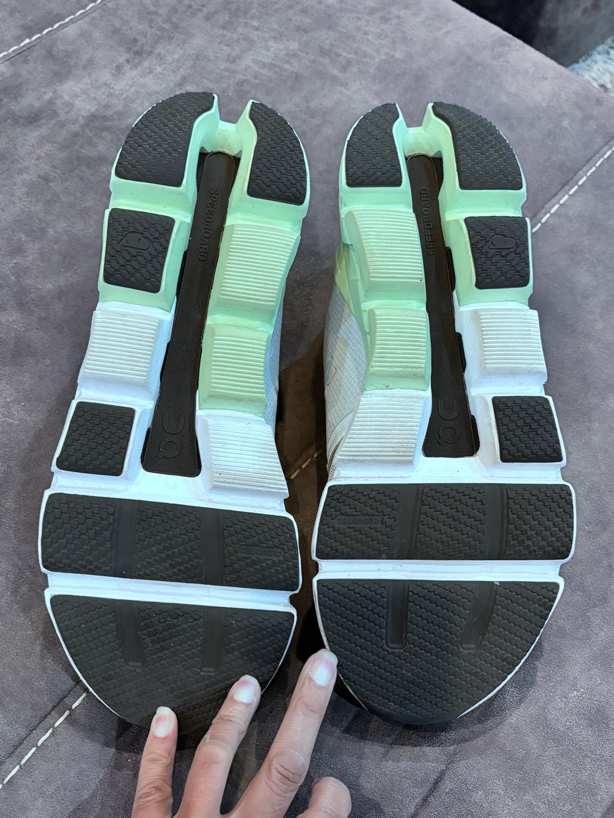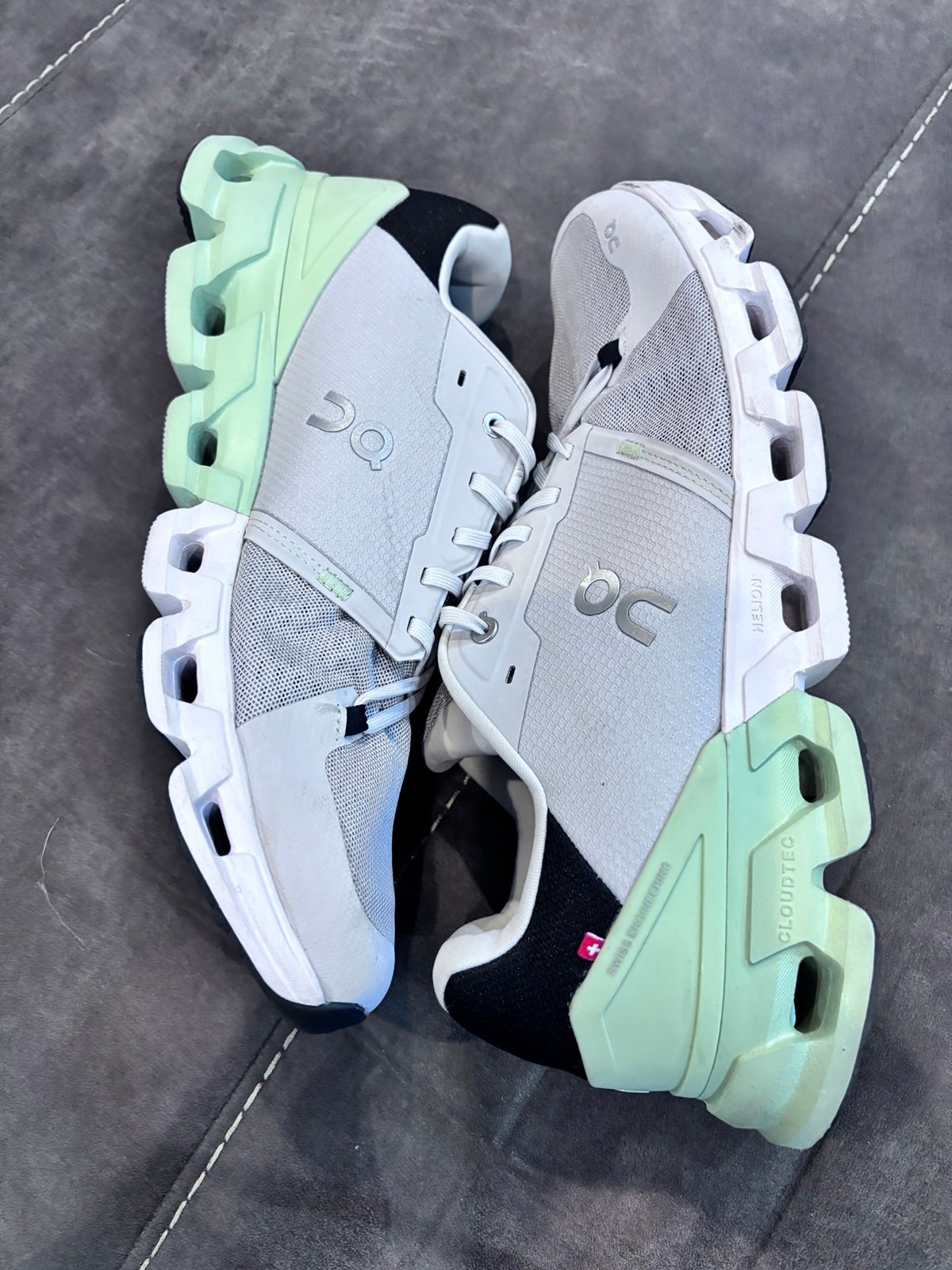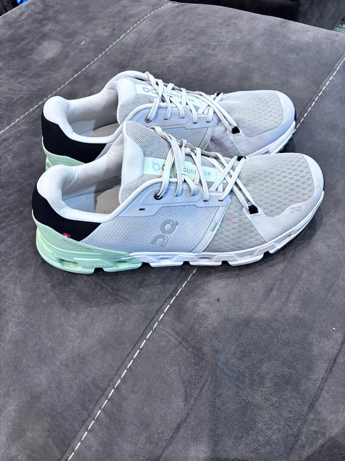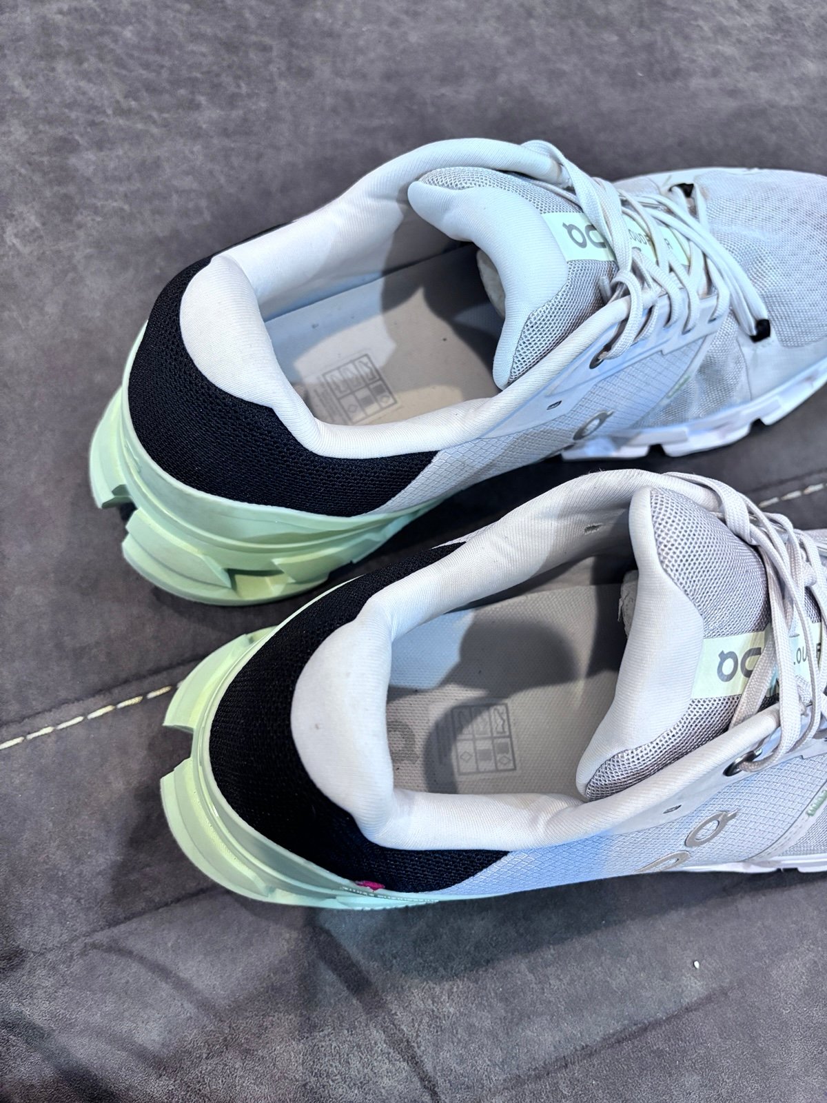 On Cloudflyer 4 sneakers in Men’s US 13. Built with CloudTec cushioning and Helion™ superfoam, they deliver a powerful, plush ride for runners or anyone who loves ultra-cushioned sneakers. This colorway combines sleek gray with vibrant lime and a black heel accent.