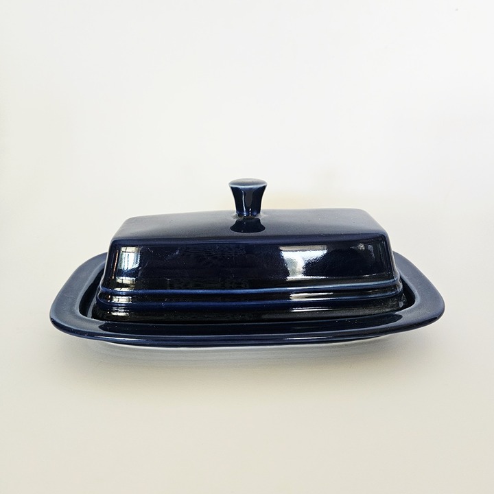 The HLC Fiesta USA Cobalt Blue Butter Dish is a stylish and practical addition to any kitchen. Made of ceramic in the vibrant cobalt blue color of Fiesta Fiestaware, this covered butter dish features a solid pattern and a rectangular shape. With one compartment for holding butter, this dish is both functional and decorative, perfect for serving up your favorite buttery spreads at any meal. The Fiesta product line ensures high quality and a timeless design that will enhance the look of your dining table.
