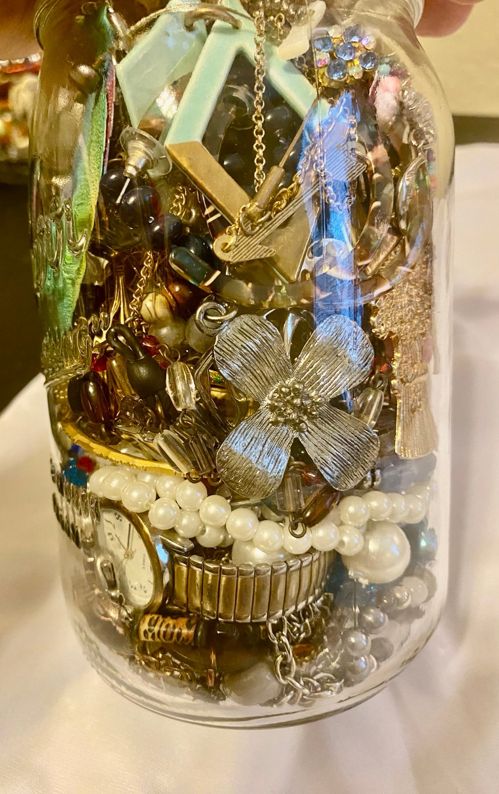 Jewelry Jar costume jewelry various pieces may contain rings, earrings, necklaces Brooches, Bracelets etc. all jewelry is in good condition and is wearable no junk. Some may be vintage as well. Also some pieces may need cleaning otherwise all good.