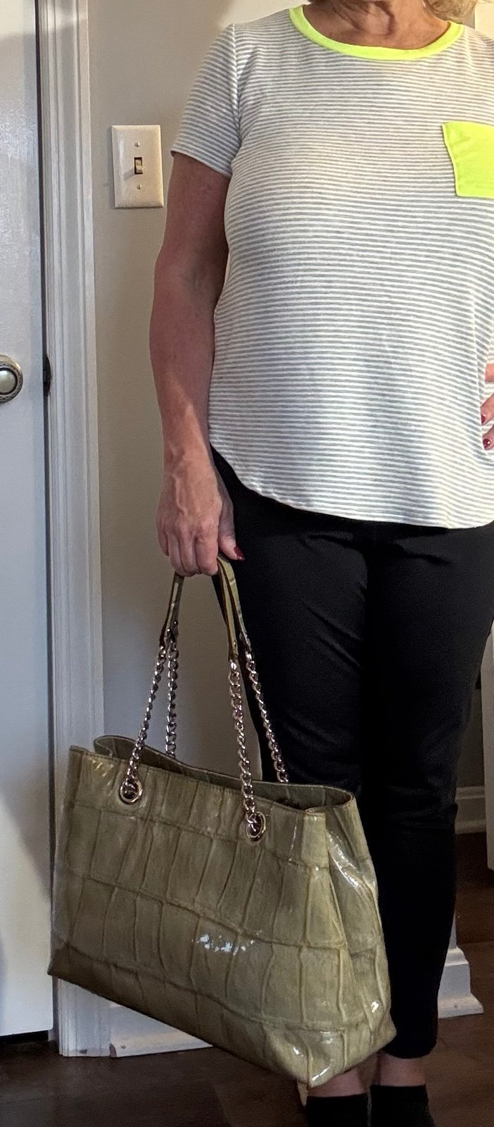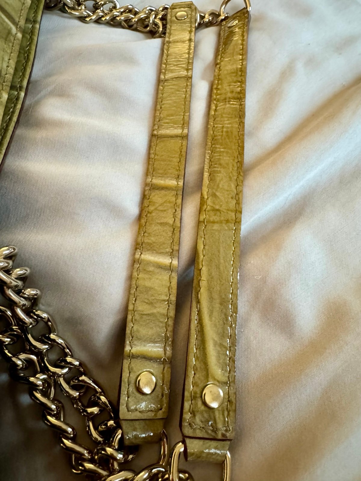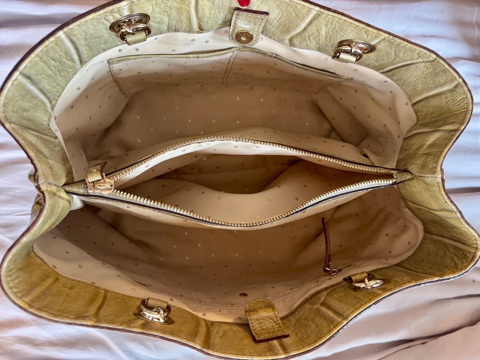 This Kate Spade Knightsbridge Helena tote is both luxurious and spacious. It features a neutral tan/brown patent leather exterior with an embossed crocodile pattern, double chain & leather handles, Kate Spade metal name plate, magnetic snap closure and 4 protective studded feet.