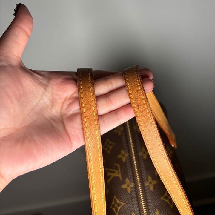 Authentic stunning bag! The overall canvas of the bag is in great condition aside of one side of the bag that has minor scuffing. There is quite a bit of creasing on exterior handles on the straps and across the bag handle parts. The interior is clean with no visible scratches or stains. 12W x 6H x 6D