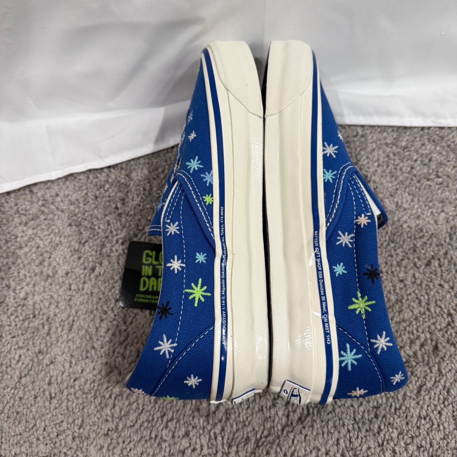 NEW & RARE Vans x AOI Industry x Better Gift Shop Blue KiraKira Slip On Sneaker with Glow in the Dark Star/Snowflake-like Embroidery. Men’s 6 or Women’s 7.5.