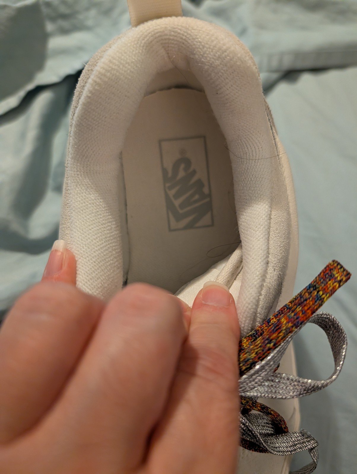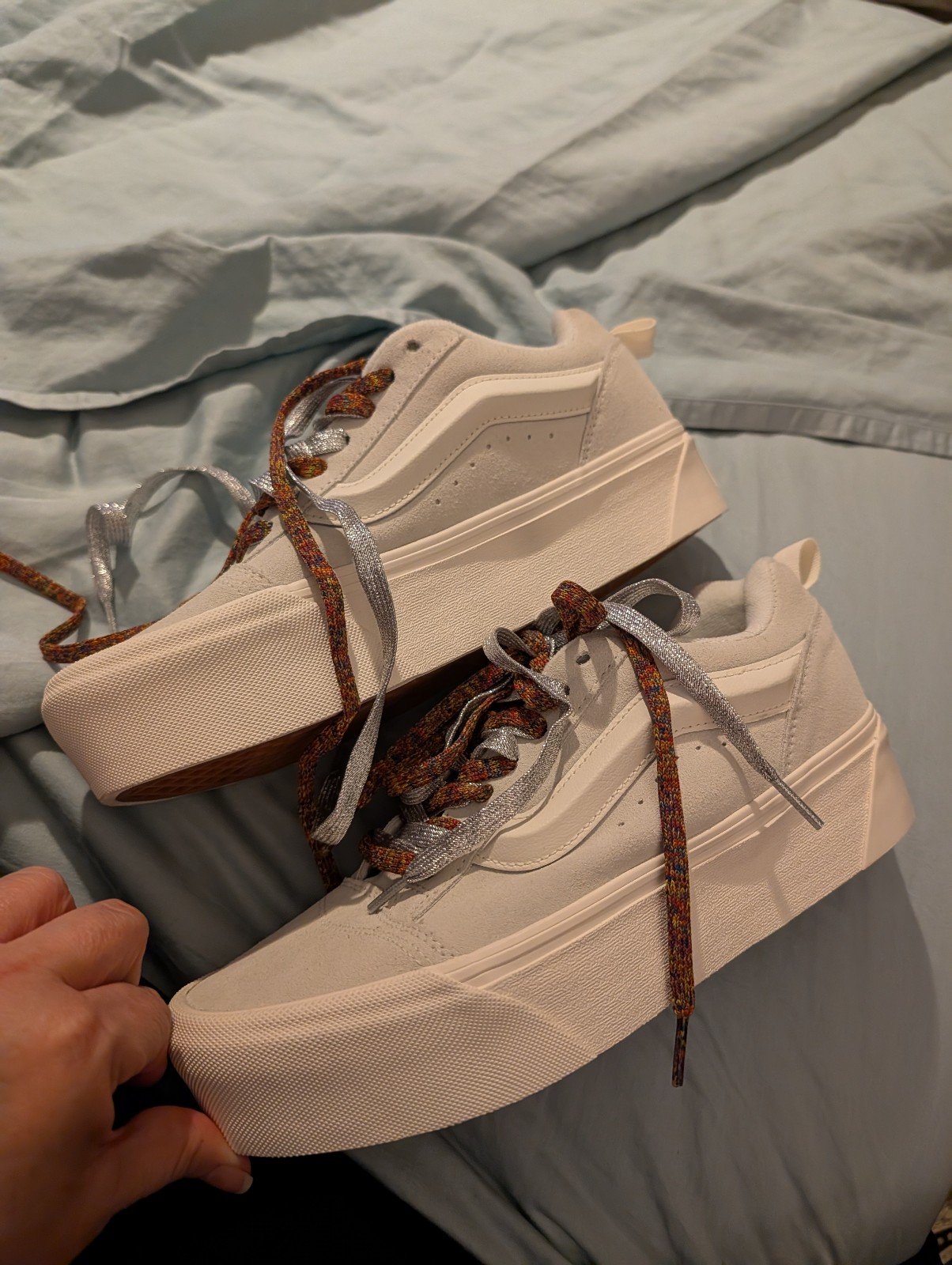 These are Sooo Cute and Comfy! I'm bummed cause when I purchased them 3 months ago, I thought they were 8 in Women's... I went to wear them for the 1st time and realized they were too big. Nothing wrong with them.... They are the coolest vans I have ever seen Bone color Suede! Double shoe laces silver and orange brown. My loss is your gain! I paid $97 for these!