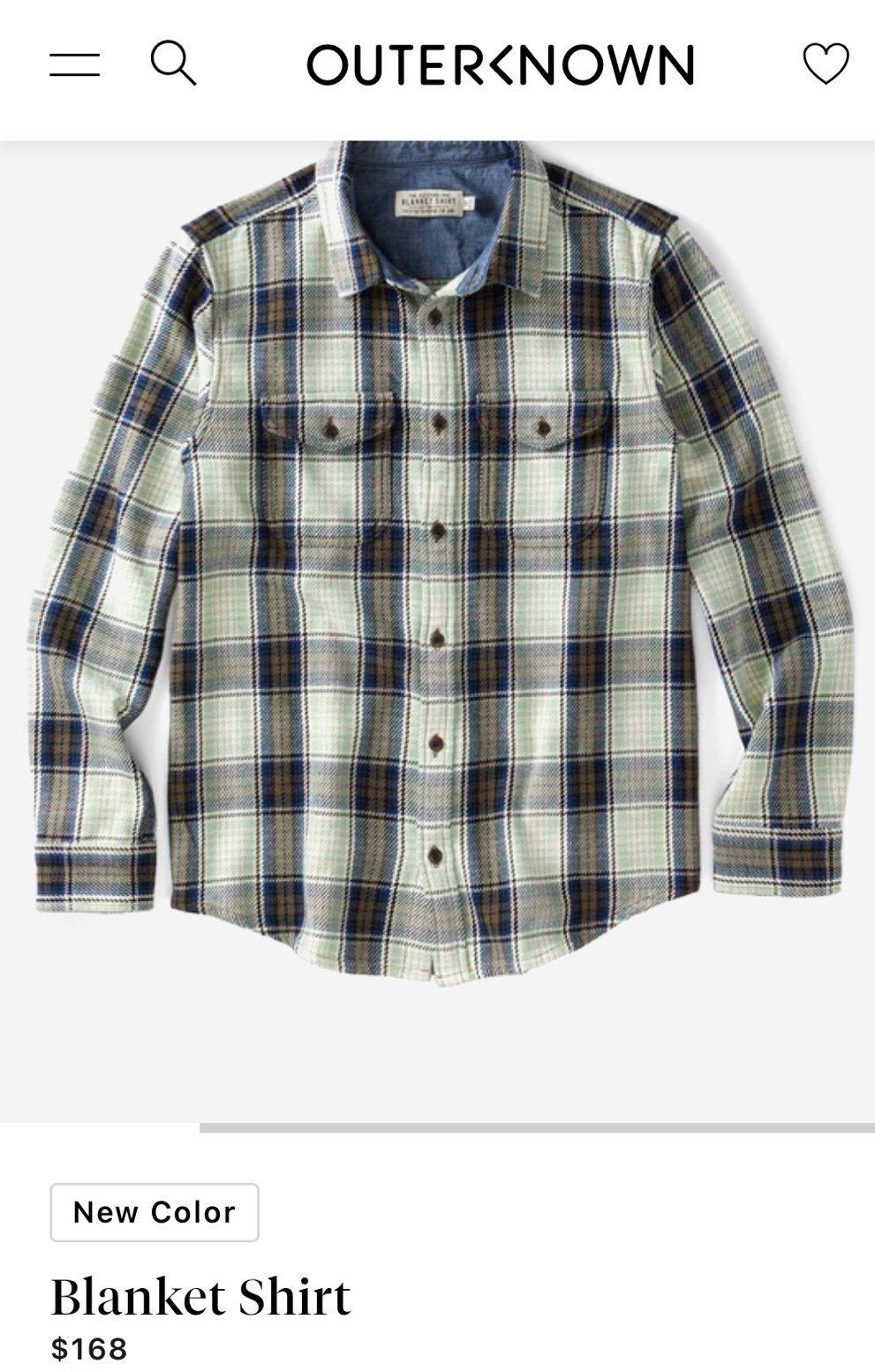 Great quality and condition men’s “blanket shirt” by Outerknown. Only flaw is a broken button at the bottom, but the extra button it came with is still attached to the label so it can be replaced. Nice fall browns and blue colors. $168 retail.