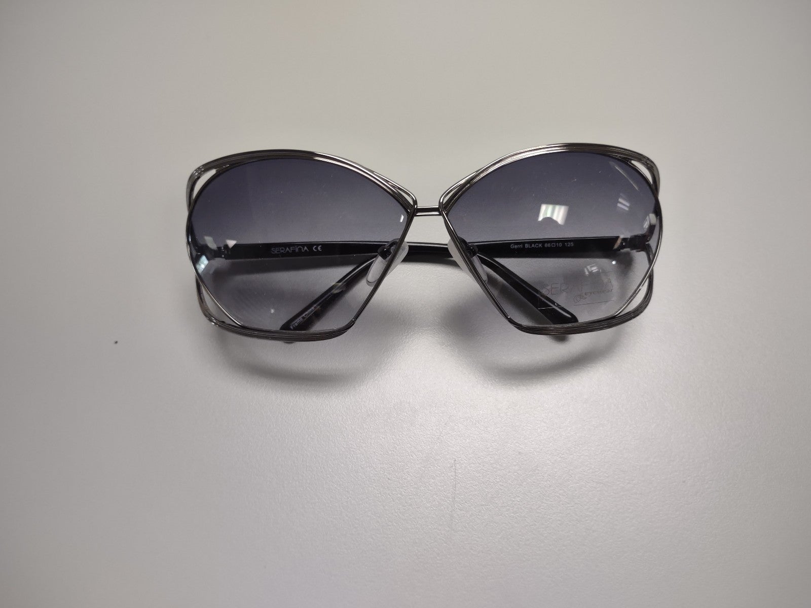 Metal, spring hinges and adjustable nose pads. Silver with black temples. 1960's -1970's look with a modern spin. Made by Serafina Eyewear. Similar to what Jacqueline Kennedy Onassis wore.