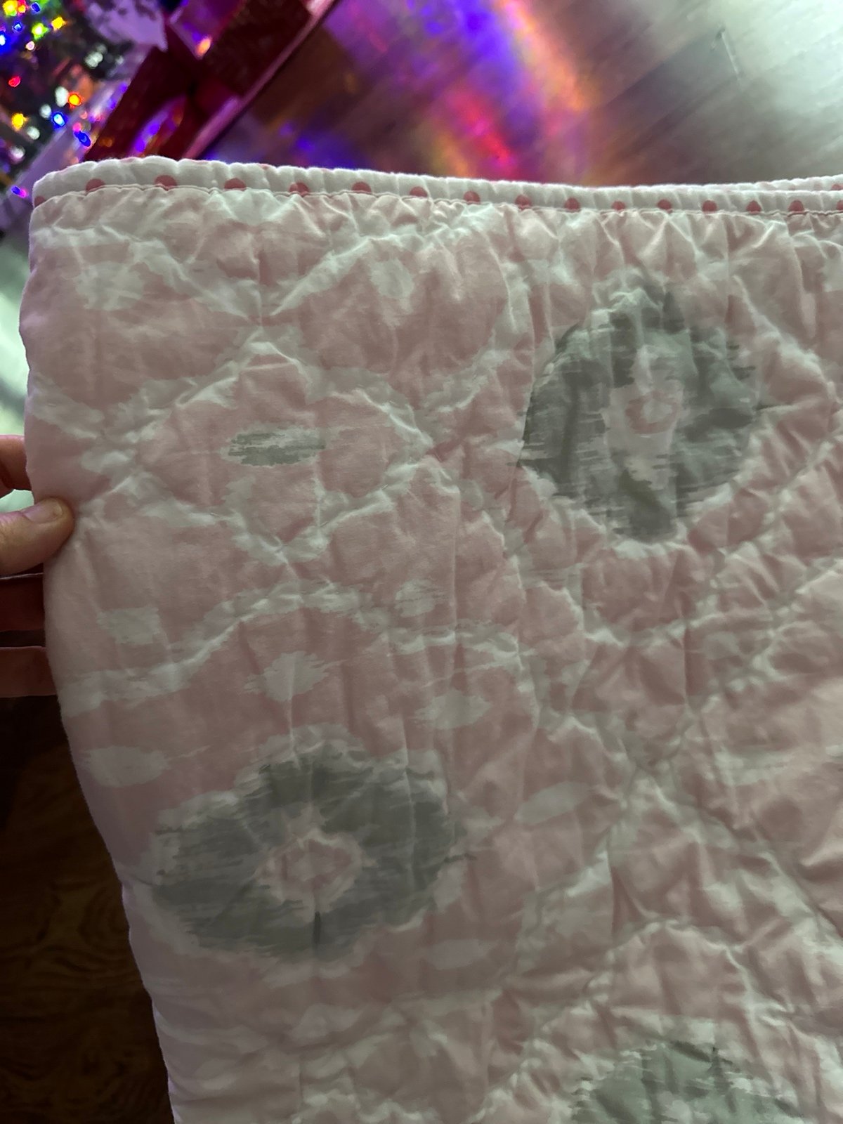 Includes a full/queen size padded (reversible to white w pink polka dots) quilt and two matching pillow shams.