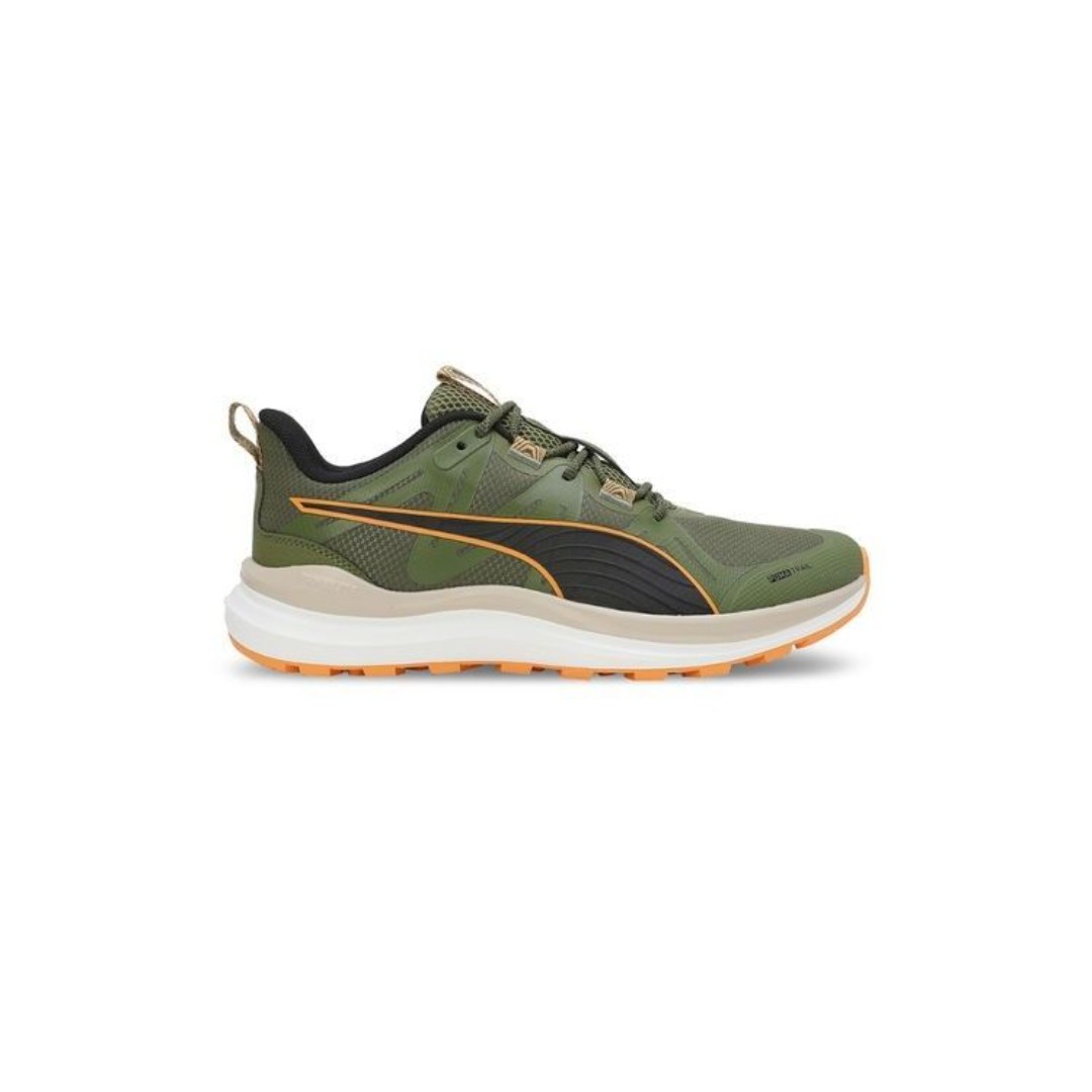 The PUMA Reflect Lite Trail Olive Green Putty Clementine sneakers in size 8.5 are a stylish and comfortable option for active men. With a lace-up closure, rubber outsole, and breathable synthetic upper material, these sneakers are perfect for running and jogging during the summer and spring seasons. The reflective features enhance visibility, while the olive green color adds a trendy touch to your activewear collection. The PUMA brand ensures quality and performance, making these sneakers a reliable choice for outdoor activities.