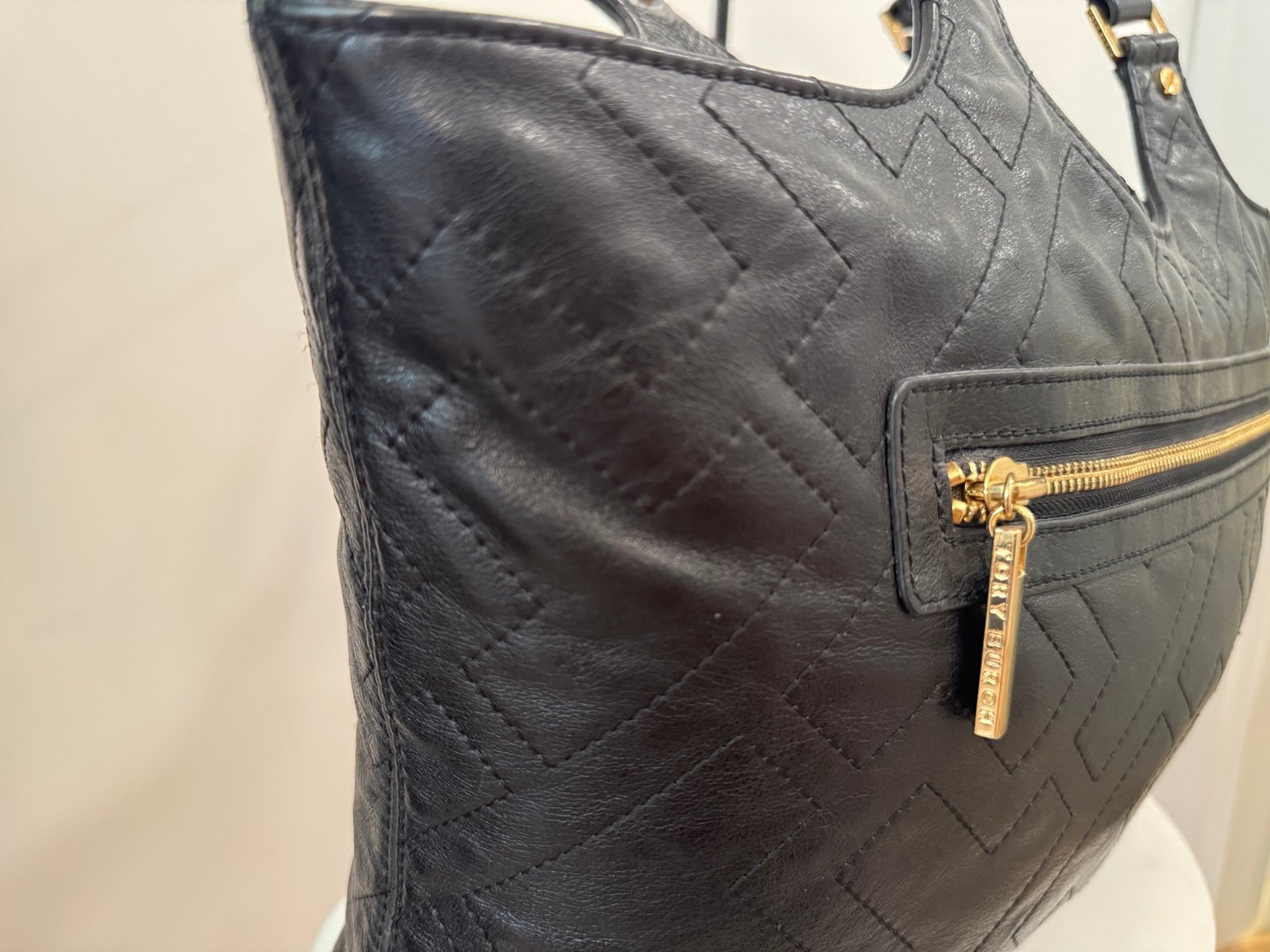 This elegant black quilted tote bag is perfect for any occasion. Its sleek design and spacious interior make it a must-have accessory. The gold accents add a touch of luxury.