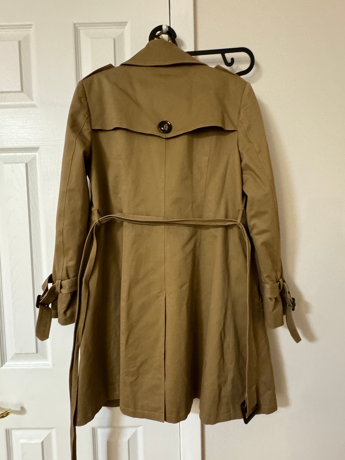A classic double-breasted trench coat in a versatile tan shade, made from 100% cotton. Features include a wide collar, shoulder epaulettes, adjustable sleeve straps, and a belt to cinch the waist. Shoulder width is 16 inches and length is 35 inches, suggesting a tailored, mid-thigh fit.