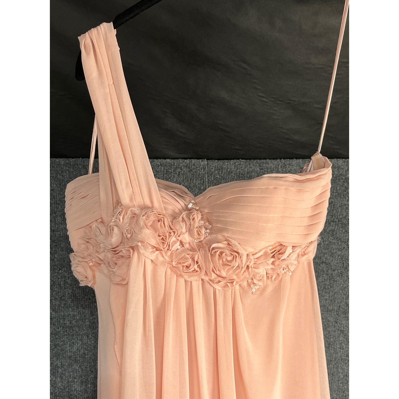 Romantic elegance unfolds in this Cachet gown, a vision in delicate pink chiffon. A cascade of roses adorns the bodice, accented with subtle sequins that catch the light with every movement. The flowing silhouette drapes gracefully, creating an ethereal effect. A single shoulder strap adds a touch of modern asymmetry, while the layered skirt adds dimension and depth. Imagine yourself waltzing across the floor at a prom, making a grand entrance at a gala, or feeling like a fairytale princess at a formal wedding.