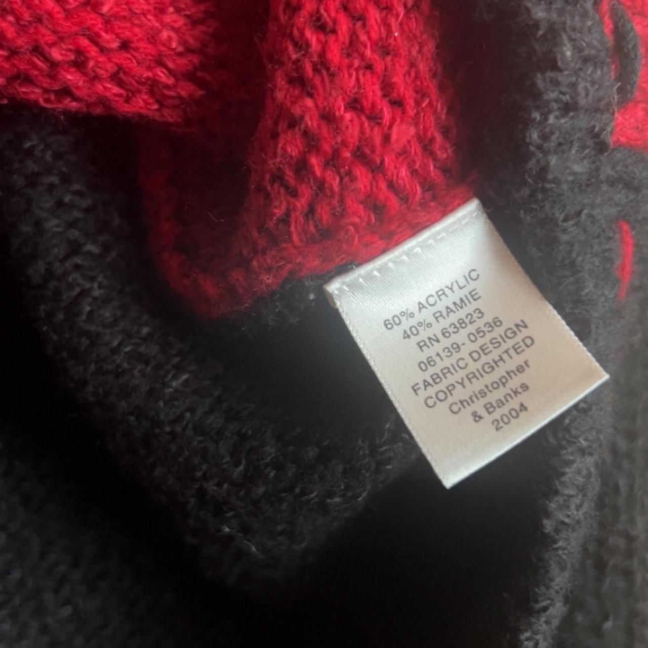 Vintage Red & Black Statement-Stitched, Hand Embroidered, Ramie-Blend, Cardigan W/Mitten & Snowflake Pocket Details by Christopher & Banks. Circa 2004. Size L. Made in Hong Kong. Beautiful condition. Ive noticed this pattern is a little harder to come by. Idk I just think its so cute and perfect for the holidays.. not too flashy, but also not boring(: