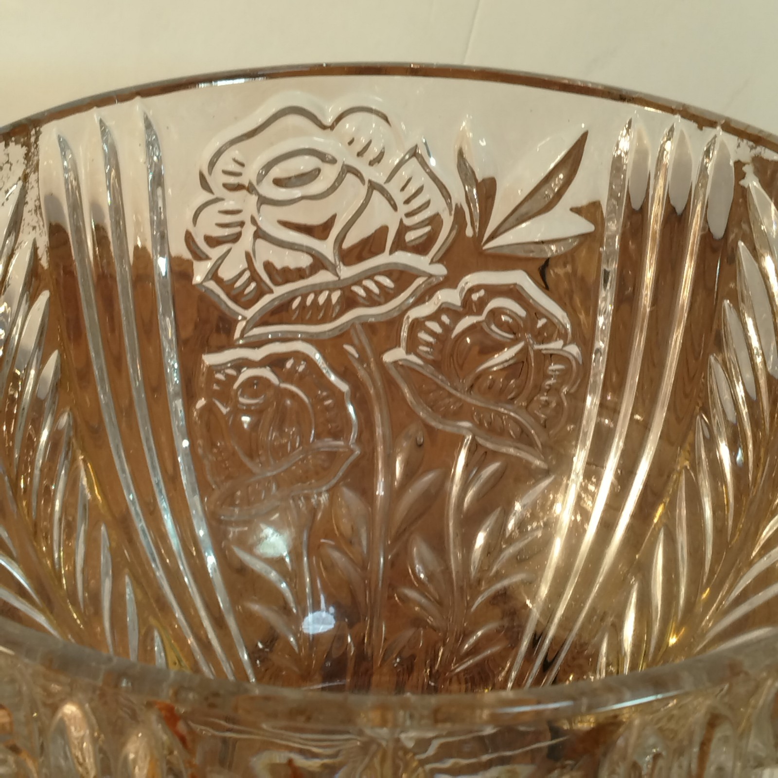 The 6 matching ups are 2 1/2 inches tall 3 inches wide I'm not sure if the maker it's beautiful vintage cut glass floral design with leaf design in middle the leafs are gold color but some of gold has worn one cup has chip in picture rest looks good IV never seen one like this it's heavy maybe crystal I'm not sure