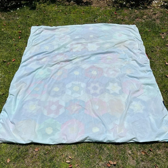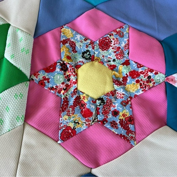 Vintage 6-Point Star Hexagon Patchwork Blanket. Handmade with a bright and colorful top side, and a solid Light Blue backing. Polyester topside, cotton or cotton blend backside. So colorful, vibrant and fun!